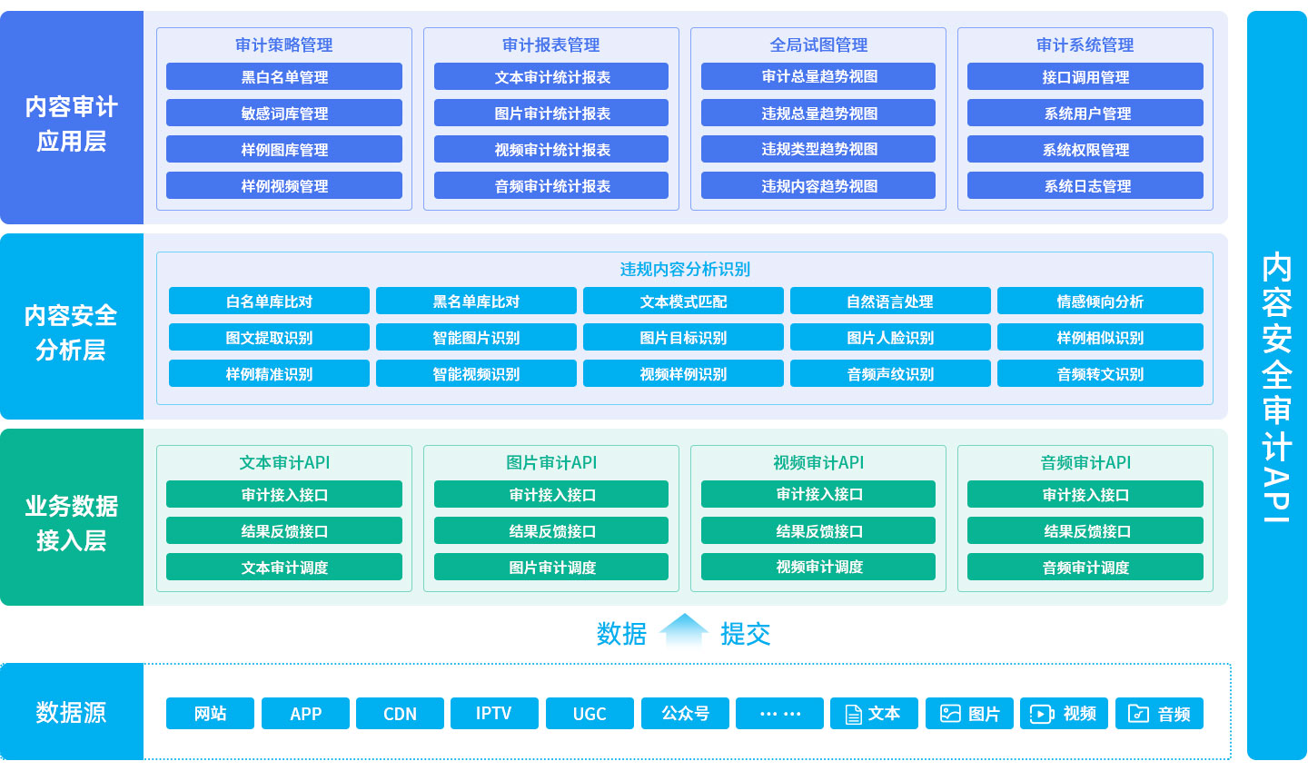 内容安全审计能力API(Content Security Audit API)是集成文本匹配识别、自然语言处理、图文提取识别、智能图像识别、图像目标检测、图像人脸识别、图像样例识别、智能视频识别等违规内容识别核心能力的标准化内容安全审计软件产品,可审计客户上传的文本、图片、视频是否含有涉黄、涉政、涉暴、涉赌等违规内容并快速返回结果,可帮助客户大幅度降低人工审计违规内容成本;产品功能及性能可满足互联网内容提供商的内容安全监管治理需求。